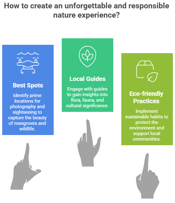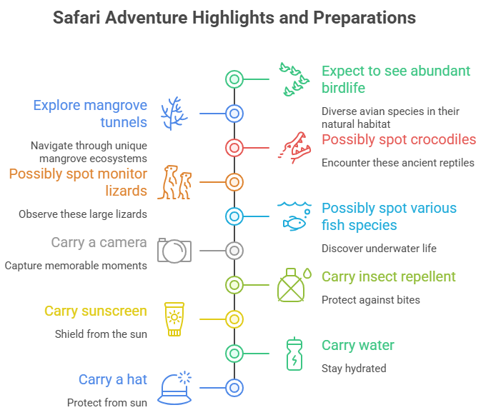 The mangrove forest experience and the sight of endemic species is often complemented by exotic bird species like kingfishers, herons, and eagles, as well as monitor lizards and otters.